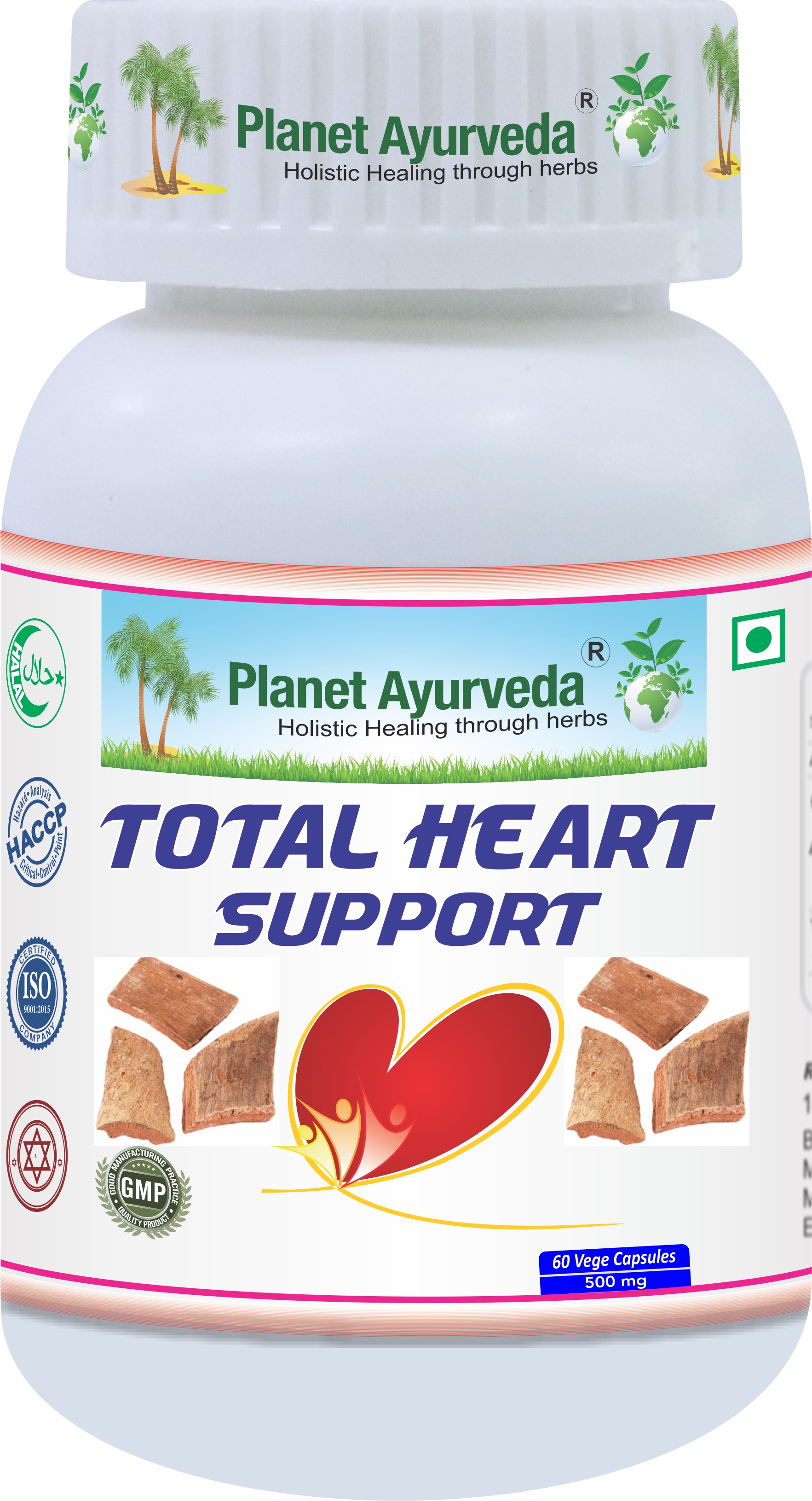 Doplněk stravy Standardizovaný extrakt 100% rostlinné Total Heart Support je komplexní ájurvédská směs 4 nejúčinnějších kardioprotektivních bylin – Arjuna, Ashwagandha, Brahmi a Shankhpushpi. Tato syn
